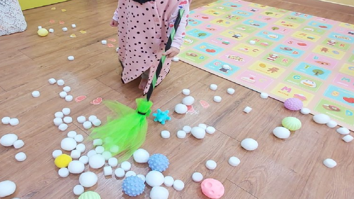 모형 빗자루와 모형 눈을 이용해서 겨울에 눈을 치운다는 것을 알려주는 놀이활동을 하였답니다.