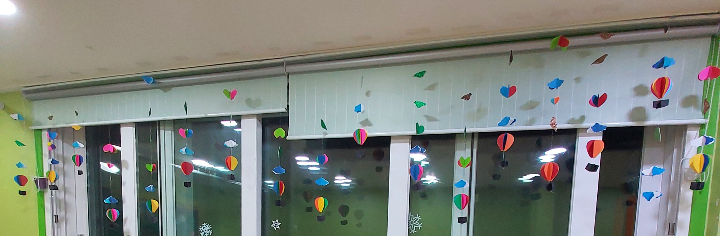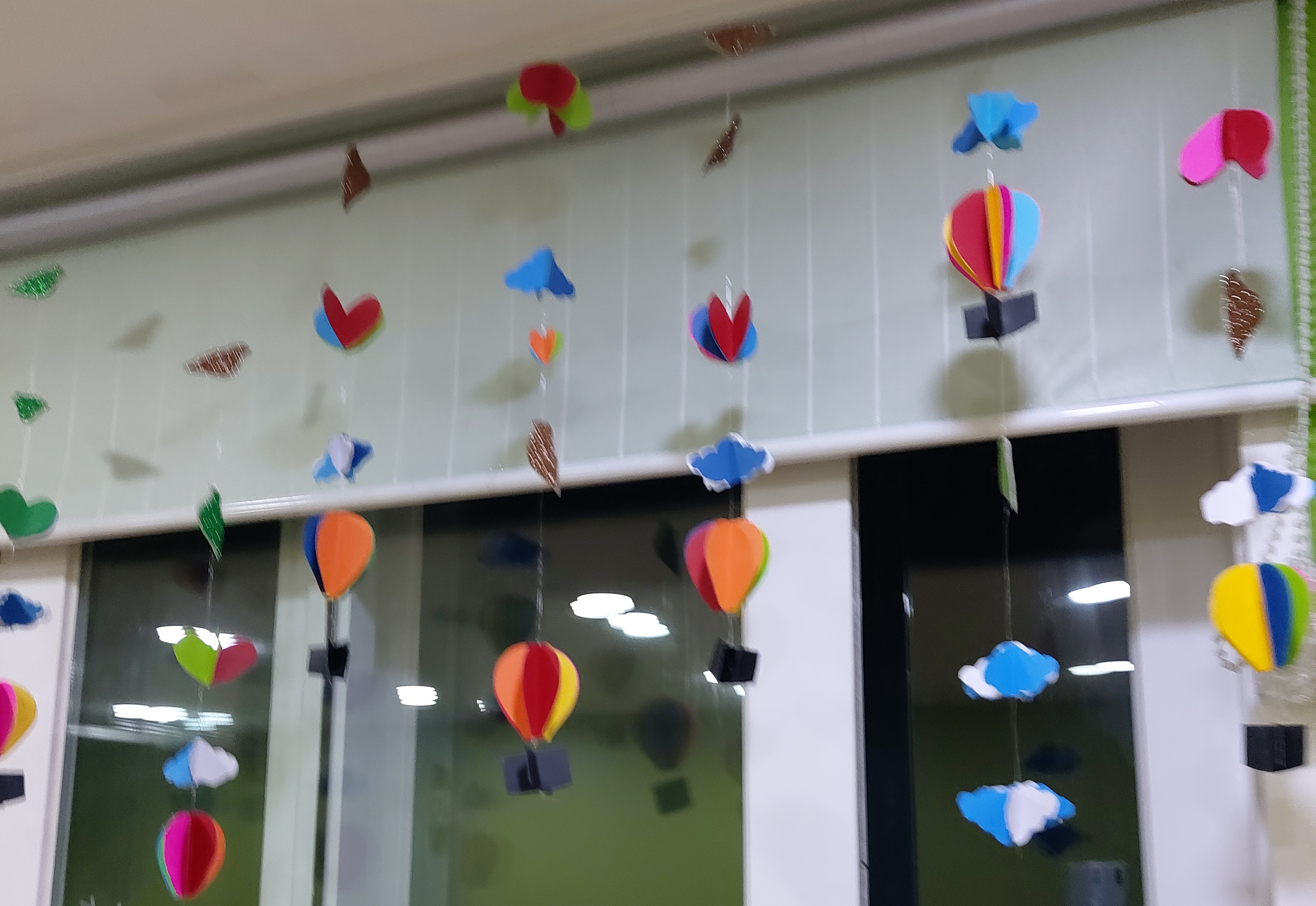 색도화지를 오리고 붙여서 열기구, 구름, 하트, 새가 달린 모빌을 만들었어요. 창가에 다니까 넓어서 휑했던 교실이 따뜻하고 아기자기한 분위기로 바뀌었답니다. 구름이랑 열기구, 새는 도안을 뽑아서 오렸어요.글루건으로 낚시줄에 붙여서 만들었어요.손이 많이 가는 작업이었답니다.