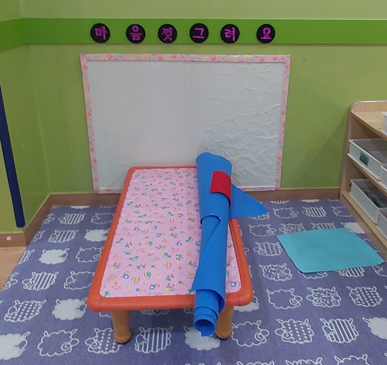 이번에 넓은 교실을 맡게 되어 한쪽 벽면에 아이들이 마음껏 예술혼을 불태울 수 있는 공간을 만들어주었답니다.아이들이 원하는 만큼 벽에 그림을 그릴 수 있게 되었어요.