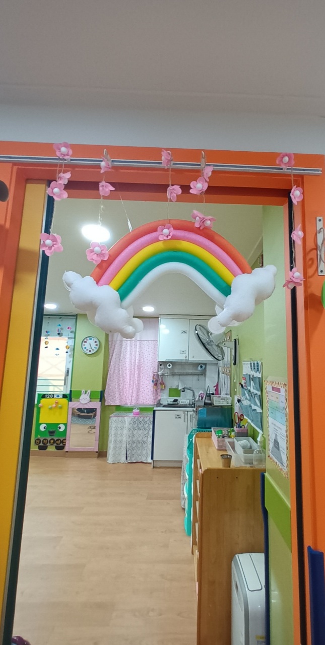 봄을 맞이하여 벚꽃 모빌을 교실 입구에 달았어요. 뒤에는 무지개 모빌이에요. [벚꽃 모빌 만드는 방법]1. 연분홍색 부직포를 꽃모양으로 자른 후 가운데에 스티로폼 공을 글루건으로 붙인다.2. 낚시줄에 글루건으로 꽃모형을 붙인다.