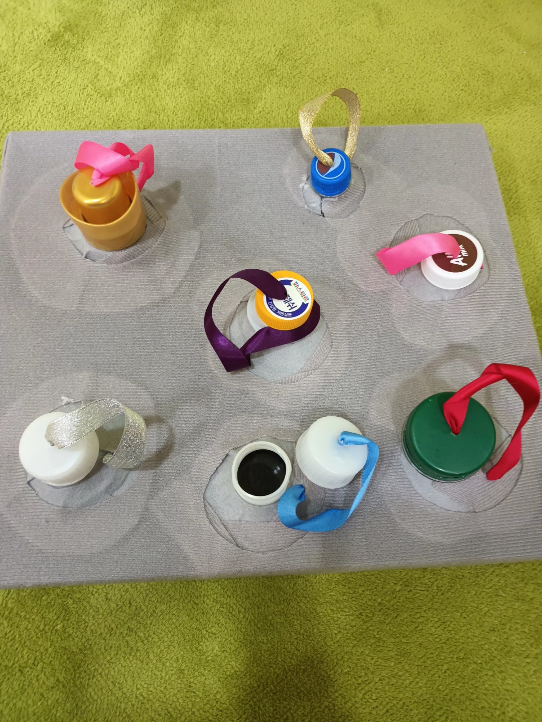 선물세트 상자에 구멍을 뚫고 각종 페트병의 상단 부분을 자른 것을 끼워서 소근육 발달에 좋은 교구를 만들었답니다.