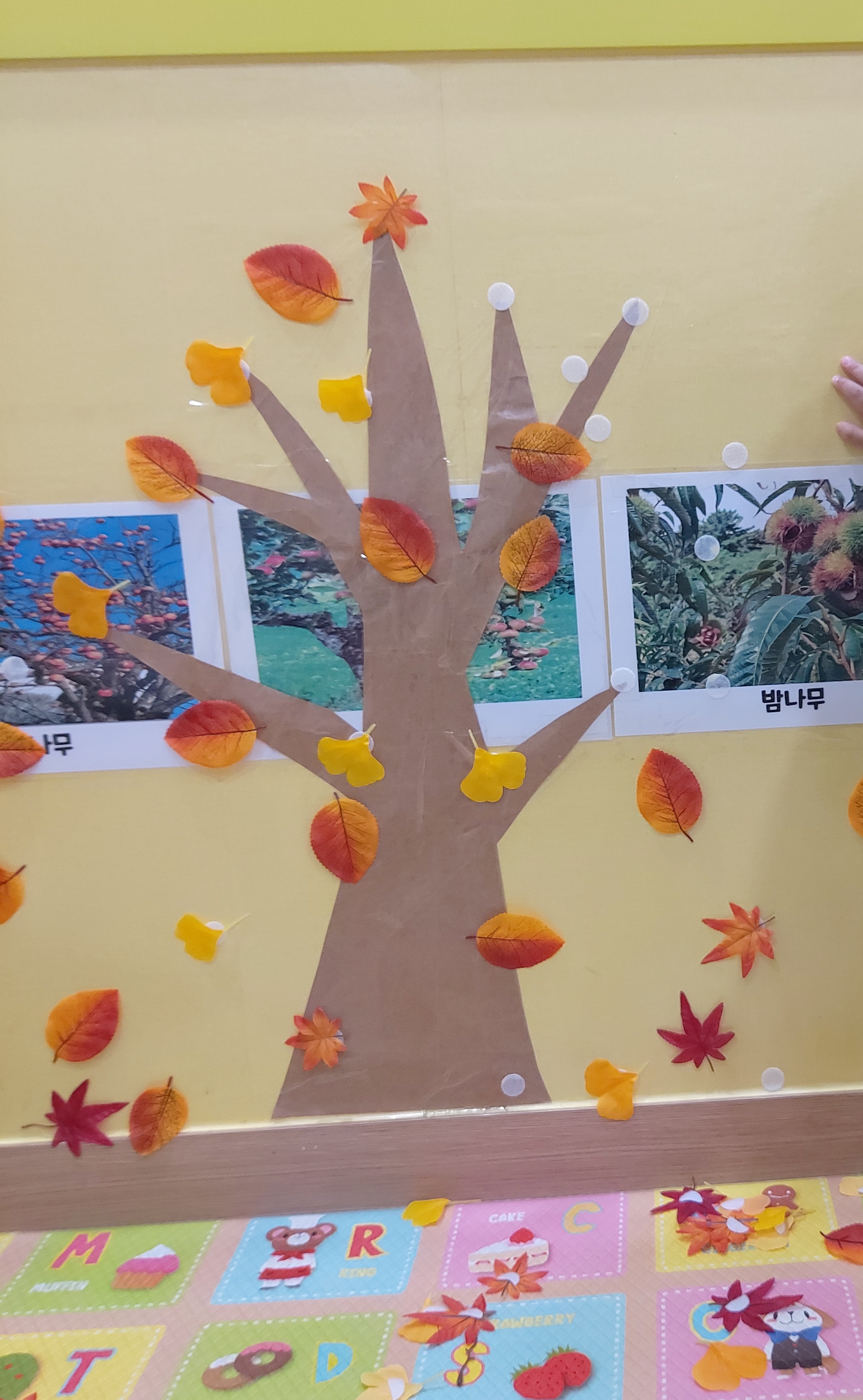 가을 나무 모형에 단풍잎을 붙이는 놀이를 할 수 있게 만들었어요.