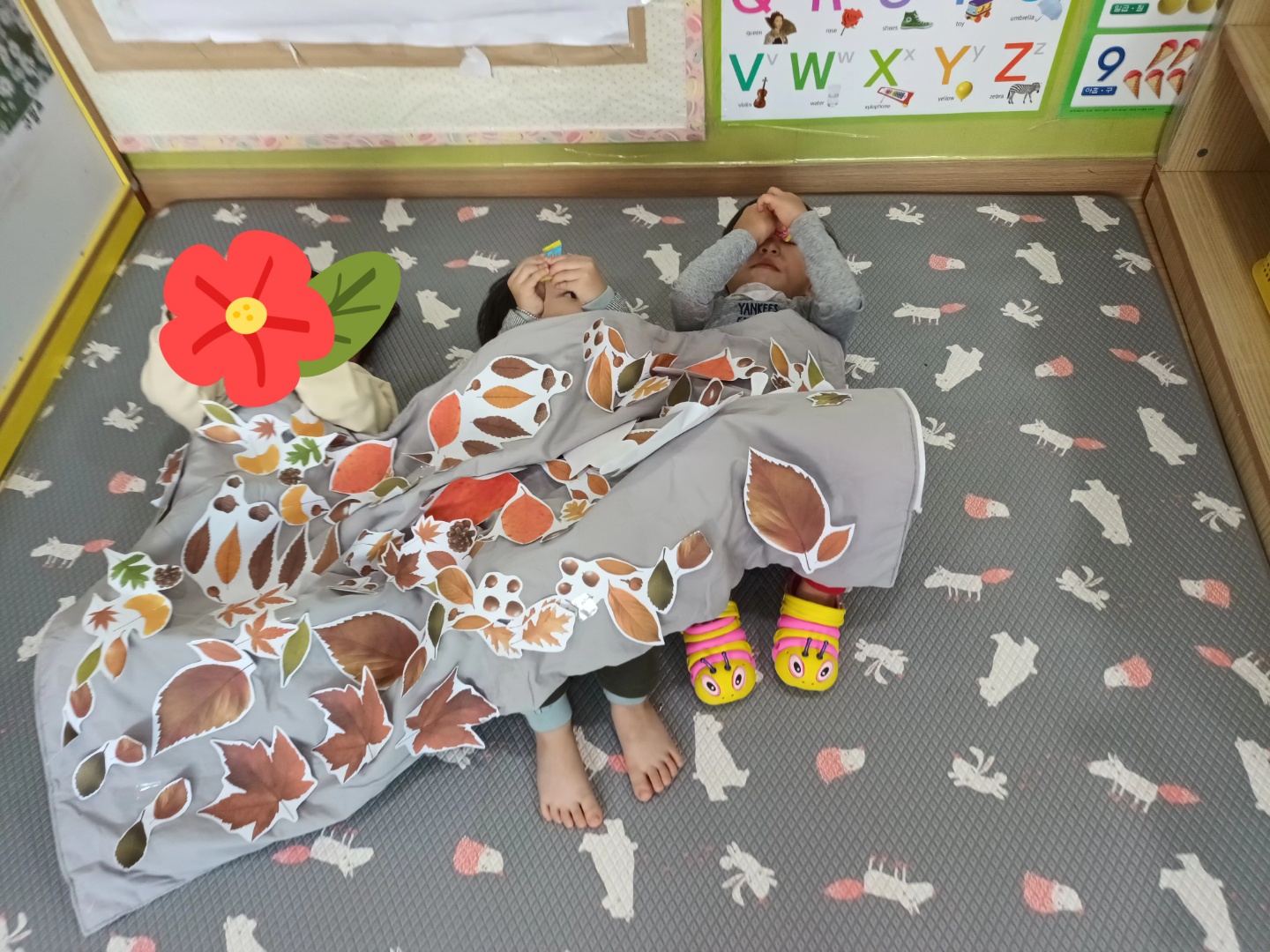 🍁낙엽 사진을 붙인 이불을 덮고 누워보았습니다.