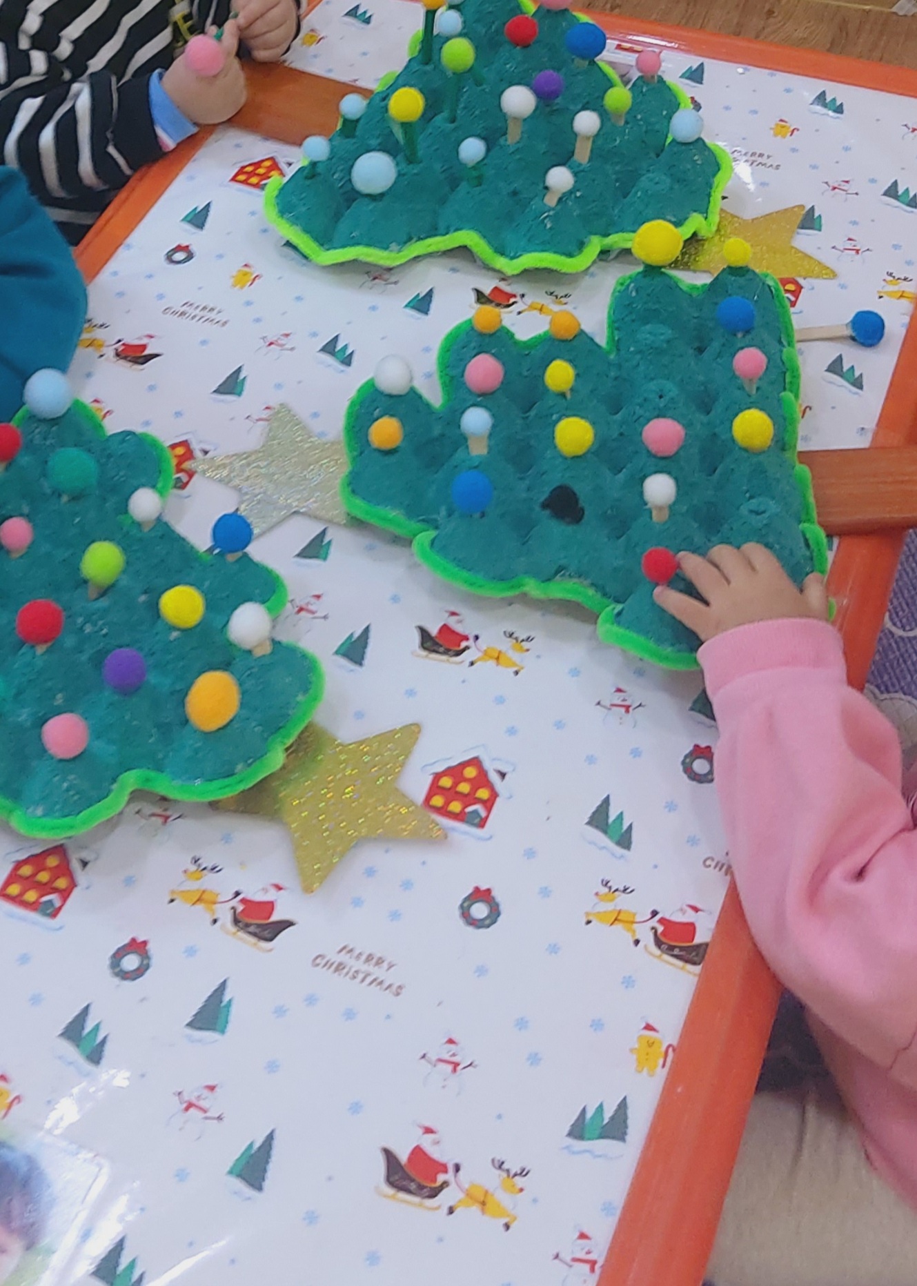 영아들이 계란판으로 만든 크리스마스 트리 위에 장식을 꽂고 있어요.